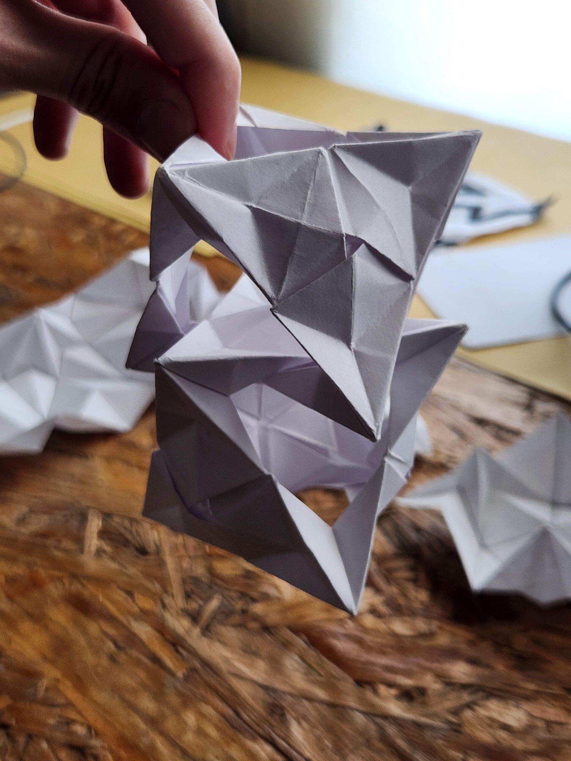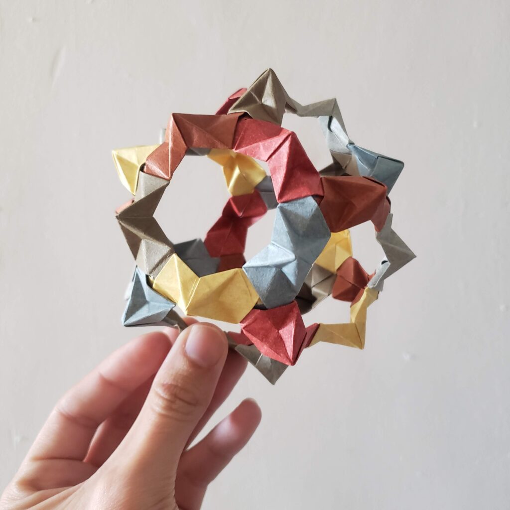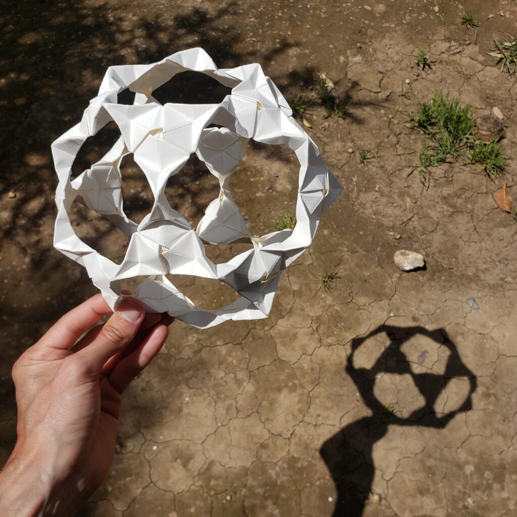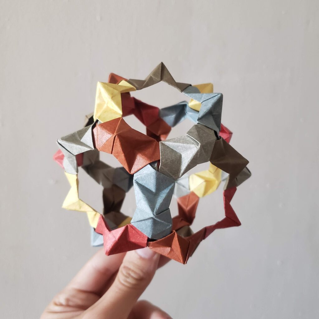 With 30 pieces you can summon the icosidodecahedron, which is usually reserved for 60 pieces, instead of 30. This is because the unit ties at its tips into equilaterial triangles and it leaves an open space between. It is a fanastic design, and I have tried to make instructions for it, but there is a step that requires me to go into 3D visualization, as in, the model has to be folded in the air a bit, it isnt a flat piece of paper laying on the table.